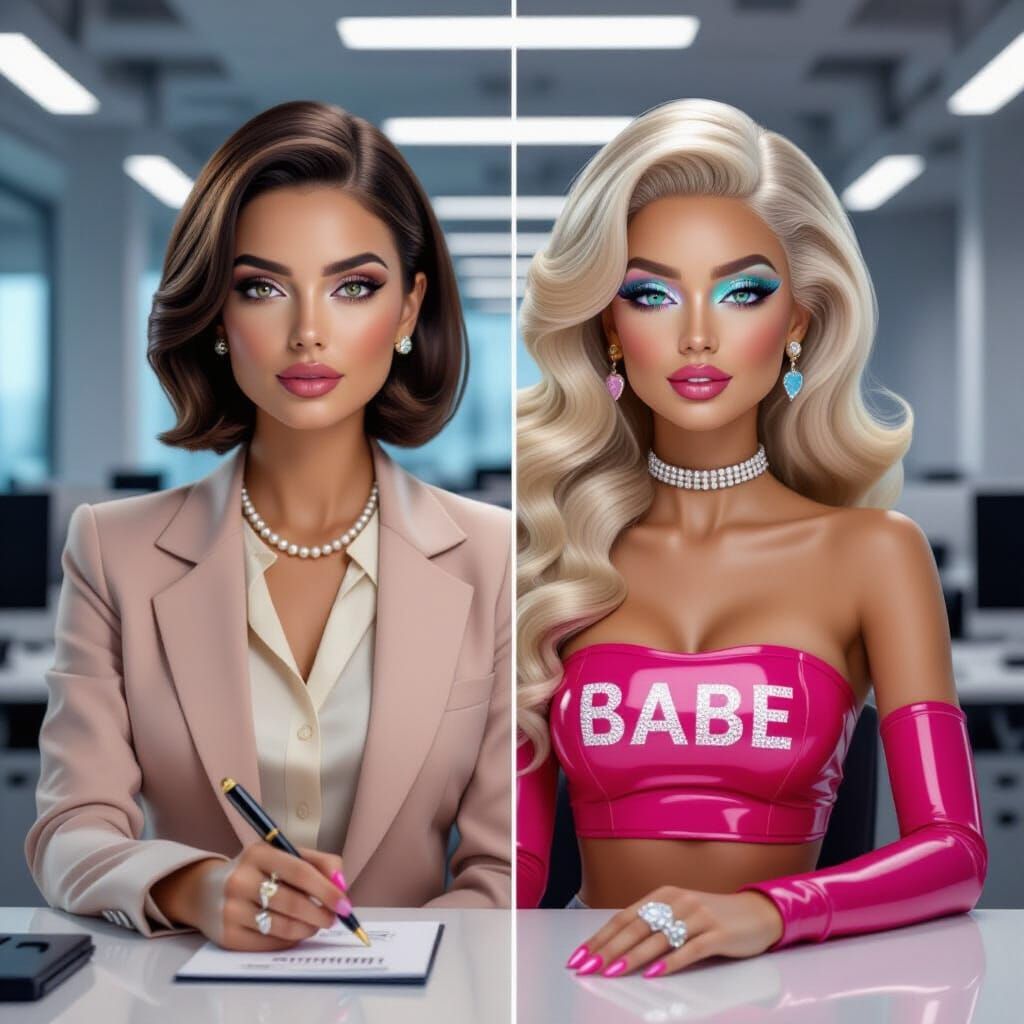 This hyperrealistic image showcases a woman's split personality, contrasting a sharp corporate look with a vibrant, playful style, all in vivid, cinematic detail.