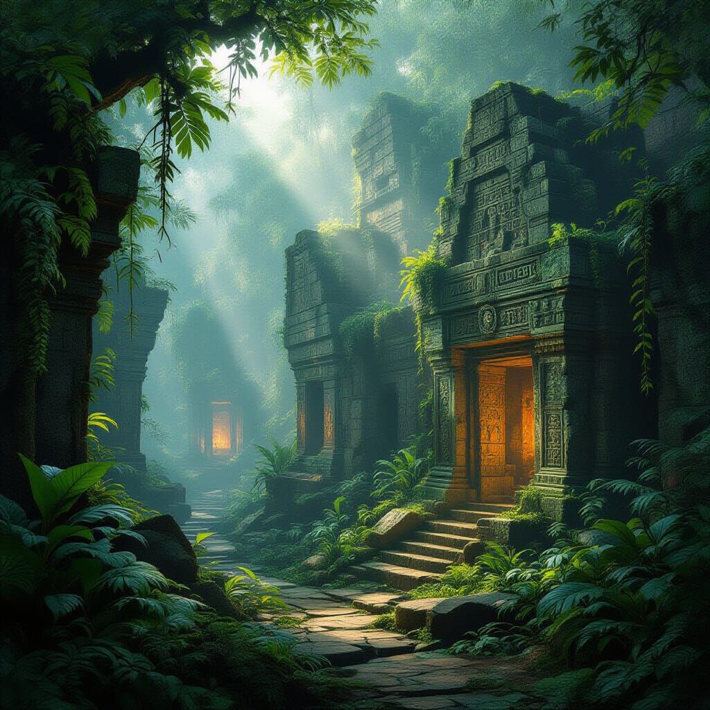 This image depicts a forgotten city reclaimed by a lush jungle. Ancient ruins glow with an ethereal light, creating a sense of awe and mystery in a mist-filled atmosphere.
