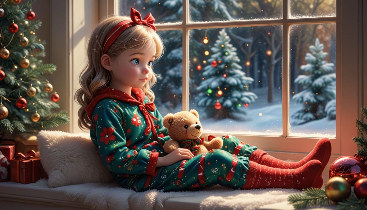 This image shows a charming digital painting of a girl in Christmas pajamas holding a teddy bear. The cozy scene includes a decorated tree and a cardinal outside the window, illuminated with soft, warm light.