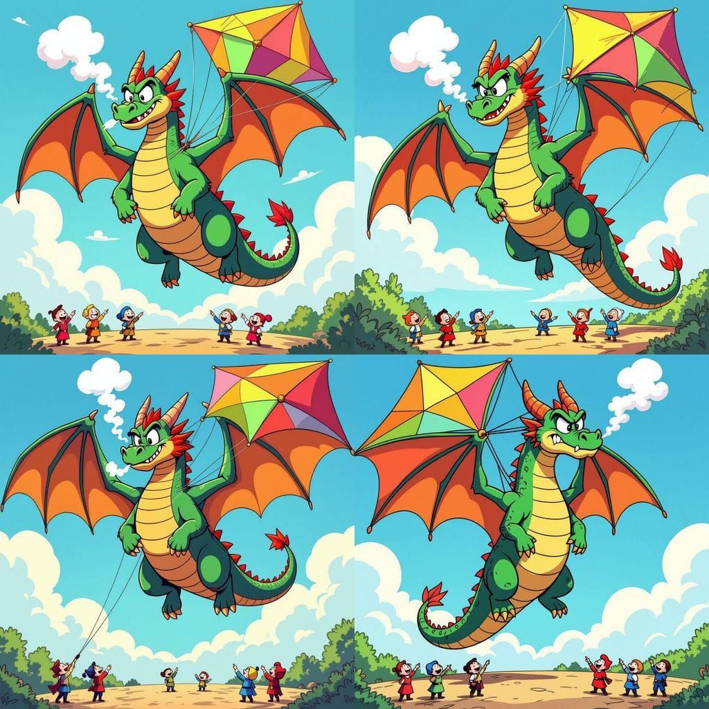 This image shows a bewildered, ancient dragon with wings tangled in a giant, colorful kite, while tiny figures below laugh. It's rendered in a vibrant, exaggerated cartoon style.