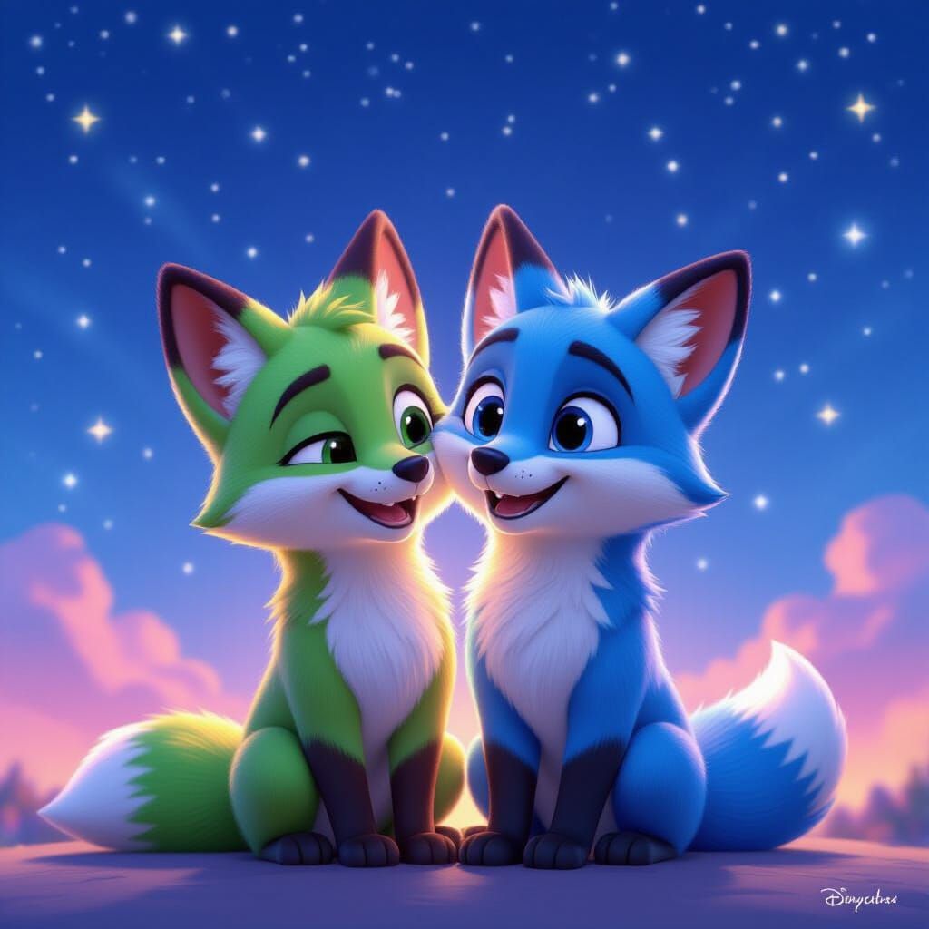 This image shows two anthropomorphic foxes, one green and one blue, sharing a loving moment under a vibrant, glowing night sky. Rendered in a cartoon style with soft lighting.