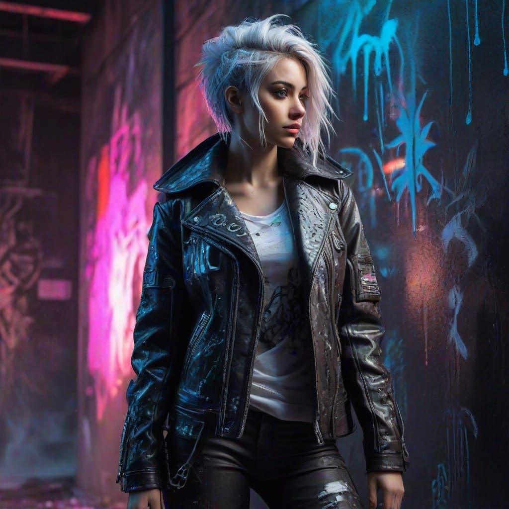 This vibrant image depicts a young woman standing in a dimly lit, icy room, surrounded by frost-covered walls and floor. Neon hues and graffiti art create a dynamic, high-contrast atmosphere, while her statement boots and leather jacket add a touch of street style.