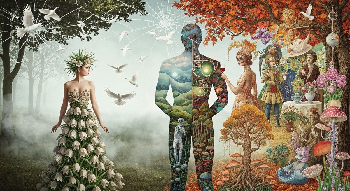 A surreal image shows a woman in a gown made of flowers. White birds fly around her in an ethereal, dreamlike scene with glowing mist, rendered with vibrant colors and textures.