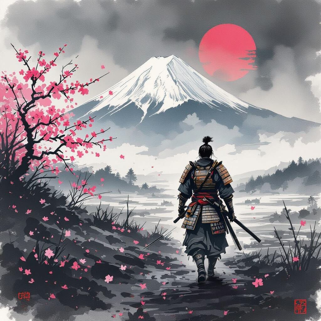 This image shows a lone samurai returning home across a desolate battlefield. The image evokes a sense of sadness and resilience, contrasting a traditional Japanese aesthetic with industrial textures.