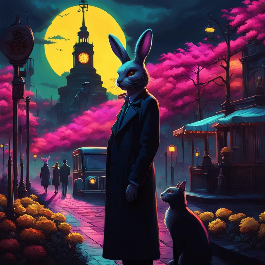 A surreal portrait of a girl in a grimdark landscape. The image features a colorful, dark fantasy style with neon accents, reminiscent of film noir, and is rendered with intricate detail and dynamic lighting.