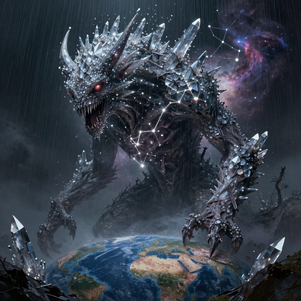 This image shows a colossal cosmic being made of rain and crystal, overlooking a sleeping world. It features nebulae within its form, rendered with dramatic lighting and a dark fantasy aesthetic.