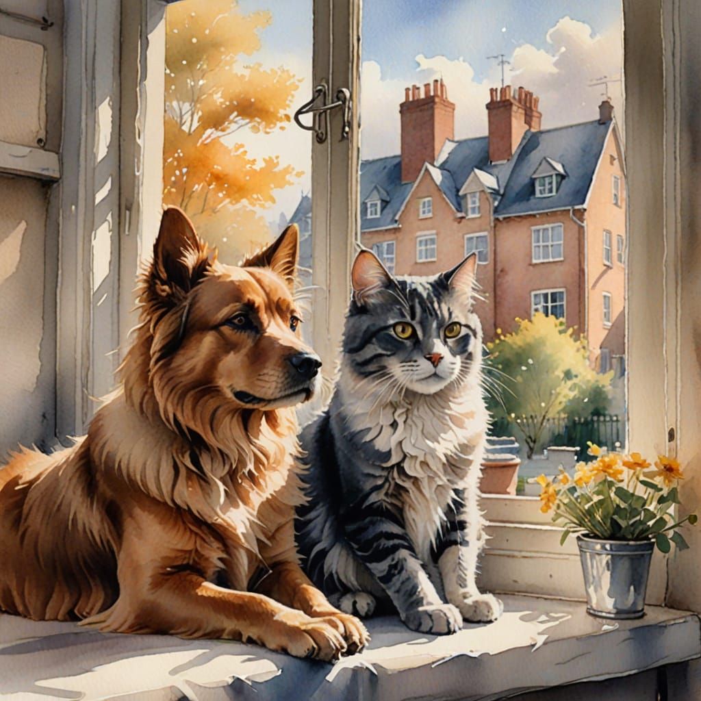 A charming watercolor painting of a dog and cat resting together on a windowsill. Rendered with soft brushstrokes and muted pastel colors, it captures a warm, dreamy atmosphere with delicate textures and subtle shading.