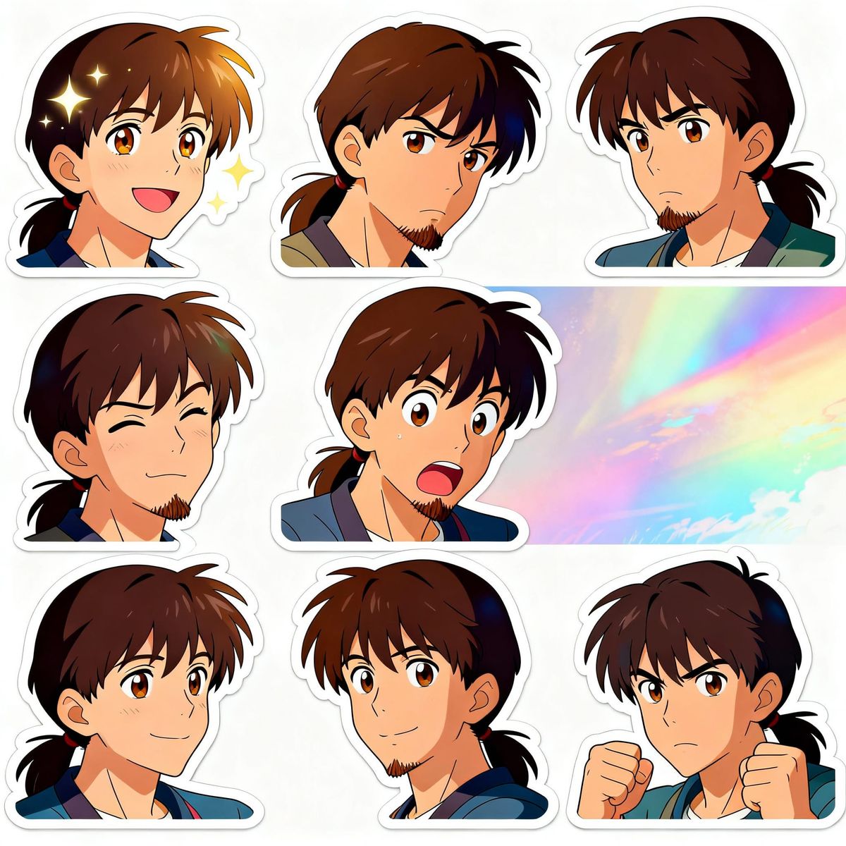Easily generate unique anime-style stickers with different emotions, featuring a 26-year-old man. Free and simple AI tool.