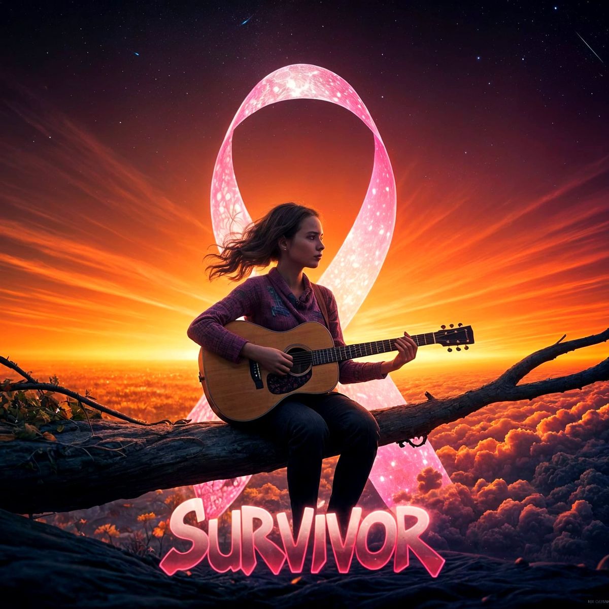 A digital artwork shows a woman playing a guitar shaped like a breast cancer ribbon against a nebula backdrop. This vibrant image blends hyperrealism with artistic expression, bathed in golden sunset light.
