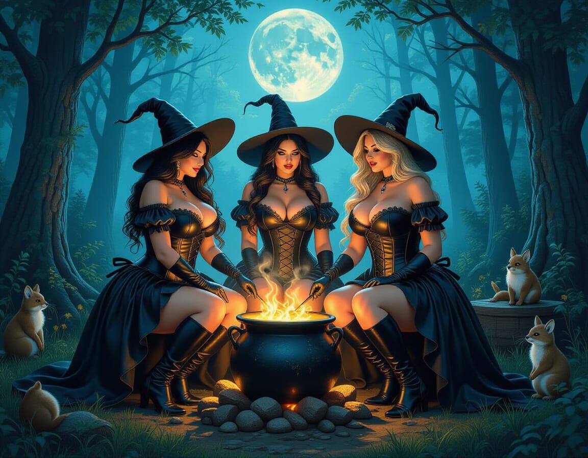 Three plus size witches in leather attire gather around a steaming cauldron in a forest clearing under a full moon, with ethereal mist and glowing moonlight. A fantasy illustration with luminous, dreamlike qualities.