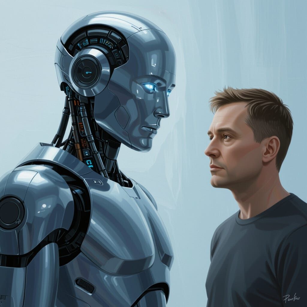 A photorealistic digital painting shows a sleek, metallic humanoid robot and a contemplative Russian man in a minimalist digital setting with soft lighting and a muted color palette.