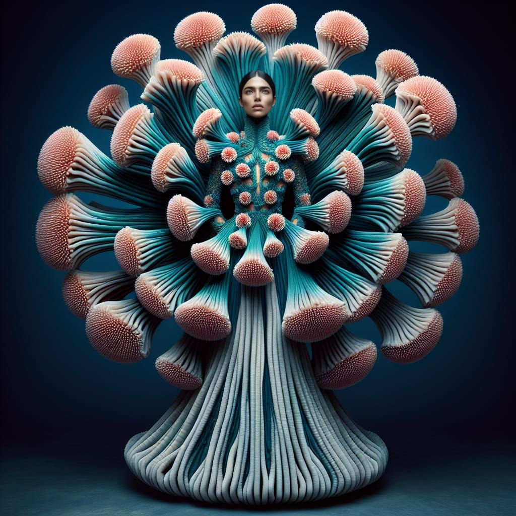This image features a stunning model in a surreal, hyper-realistic fashion photograph. The haute couture gown is adorned with radial symmetry, reminiscent of sea anemones or corals, and features soft fabric tendrils in turquoise and light pink hues.