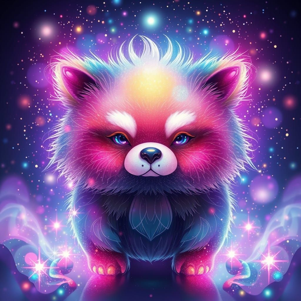 This image depicts a mystical tanuki from Japanese mythology surrounded by a vibrant, holographic aura that shimmers with a mesmerizing gloss effect, reminiscent of Hayao Miyazaki's fantastical worlds and Hirohiko Araki's delicate manga style, with neon-lit colors and sparkling light points that evoke th...