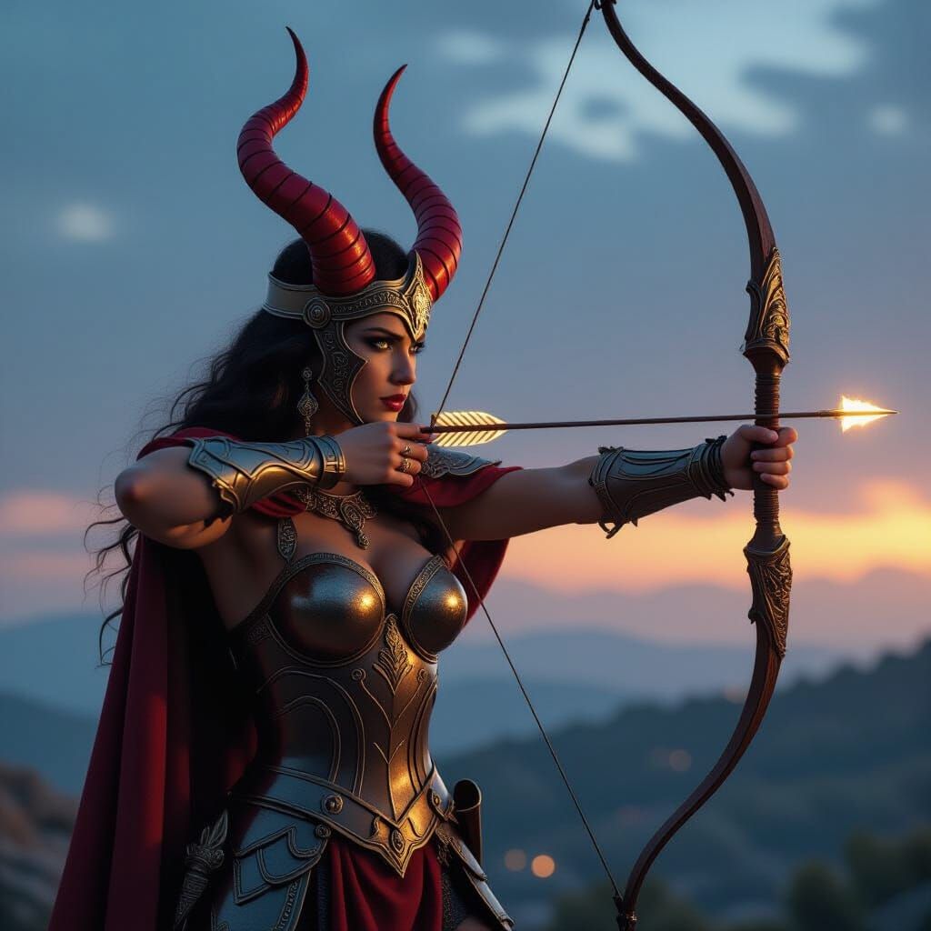 A warrior demon queen in full armor with striking red horns and black curly hair aims a glowing arrow. Epic digital painting with dramatic lighting and golden highlights.