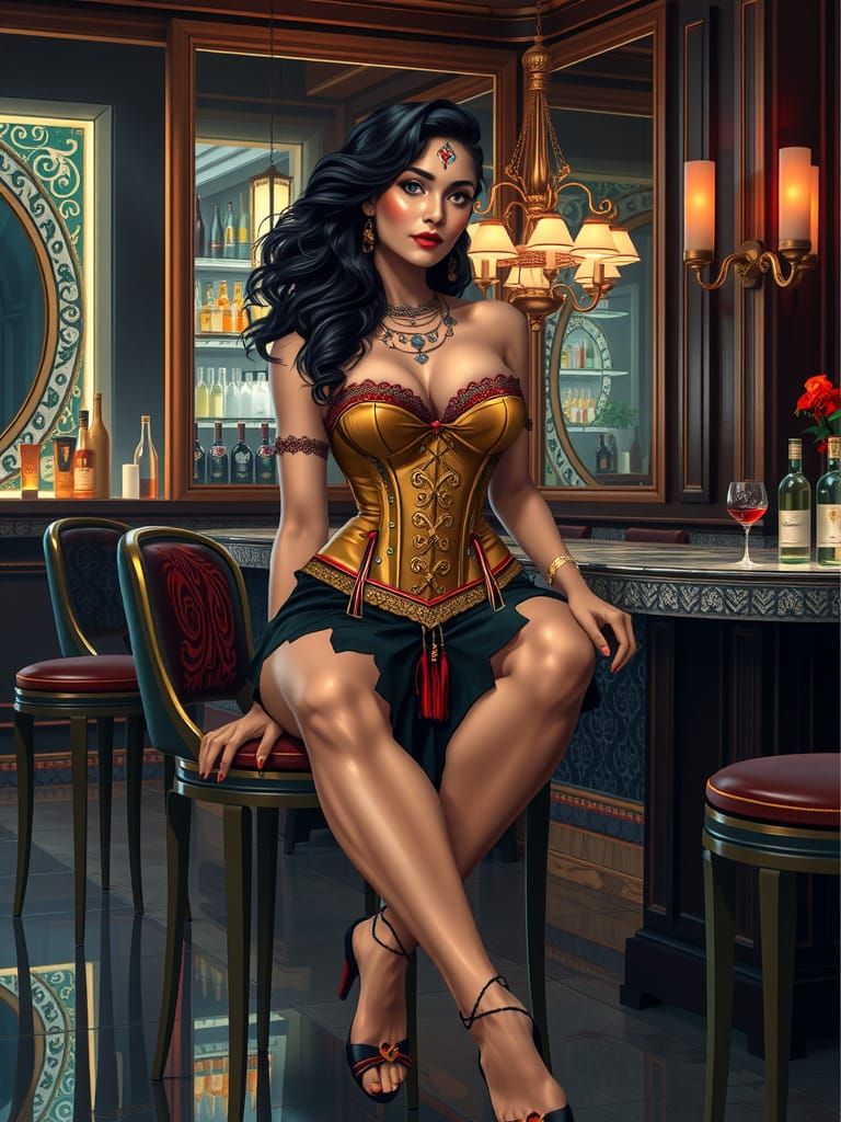 This image shows an Indian woman sitting in a bar with crossed legs. The image has an art nouveau aesthetic with vibrant colors and digital art elements.