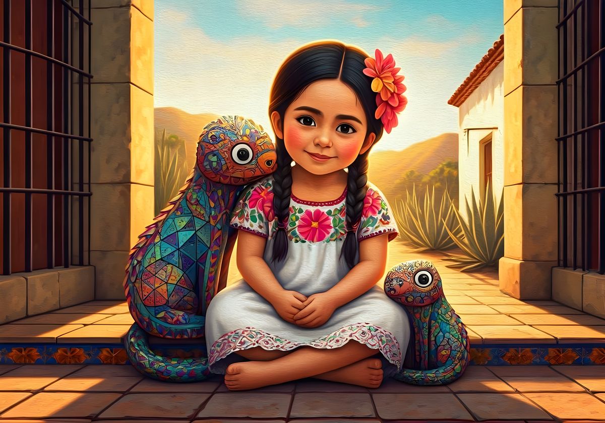 A vivid image shows a young Oaxacan girl in traditional clothing, surrounded by colorful Alebrije figures, set against a backdrop of rolling hills in the style of Mexican muralism. The artwork features mixed-media oil painting techniques.