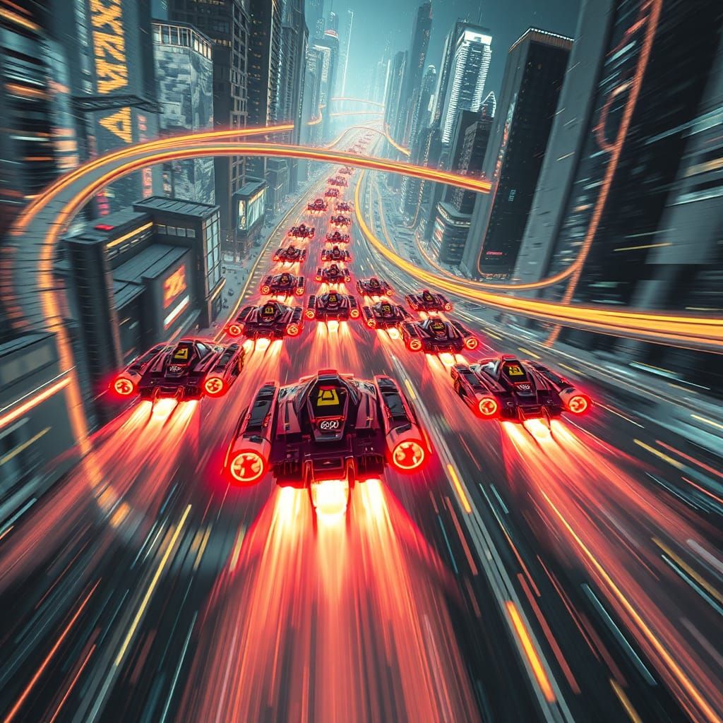 A vibrant image of flying cars racing through a futuristic cityscape at night. The scene is full of motion and energy, with neon lights and angular shapes in a cyberpunk aesthetic.