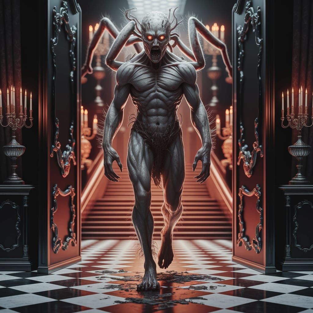Unleash your dark imagination and create terrifying creatures like this monstrous human spider hybrid with our free AI image generator
