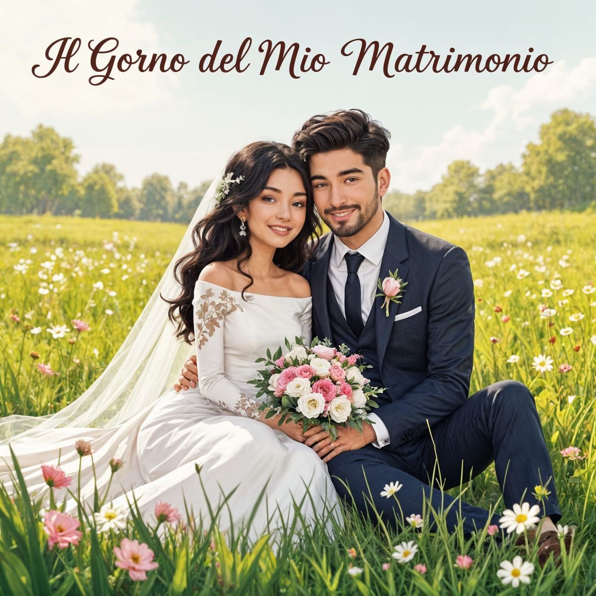 A romantic illustration of a happy bride and groom embracing in a sunlit green field. The bride holds a floral bouquet, and the couple is surrounded by a soft, natural spring landscape.