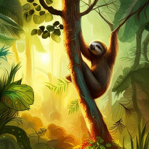 This image shows a sloth climbing a large tree in a jungle scene. The digital painting features luminous colors, golden outlines, and intricate organic tracery, creating a shiny aura.