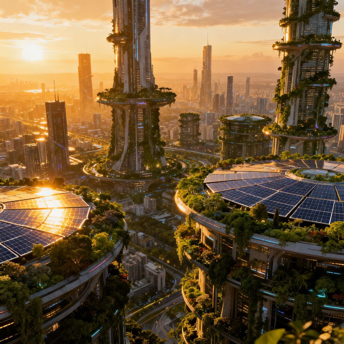 This digital matte painting depicts a hyper-detailed, utopian eco-city at sunset. Towering skyscrapers feature vertical gardens and solar rooftops, illuminated by vibrant Super AMOLED colors.