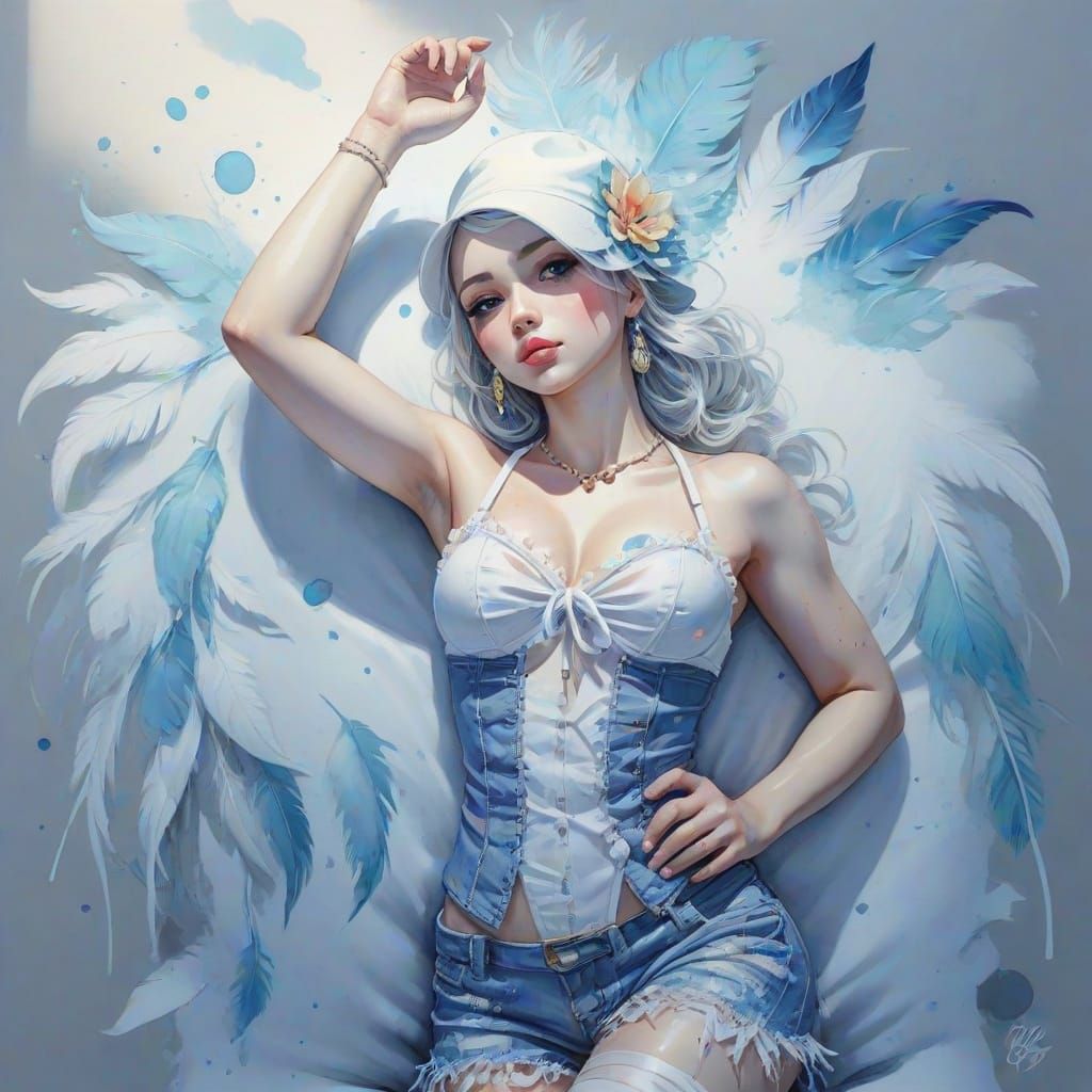 This image features a delicate watercolor portrait of a young woman in a playful, chibi-like style, adorned with vibrant feathers, pearls, and a colorful bikini, set against a white background with subtle shadows.