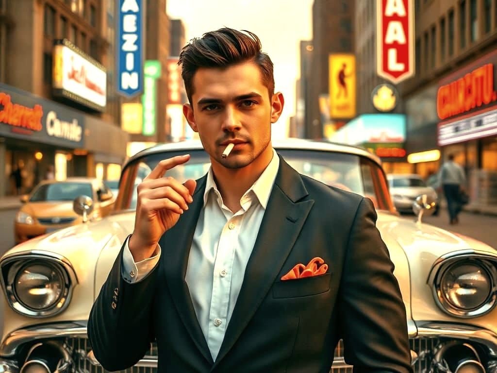 This image showcases men's 1950s fashion in a maximalist art nouveau style. A stylish man in a tailored suit stands beside a 1957 Chevy in a vibrant, detailed, photorealistic scene.