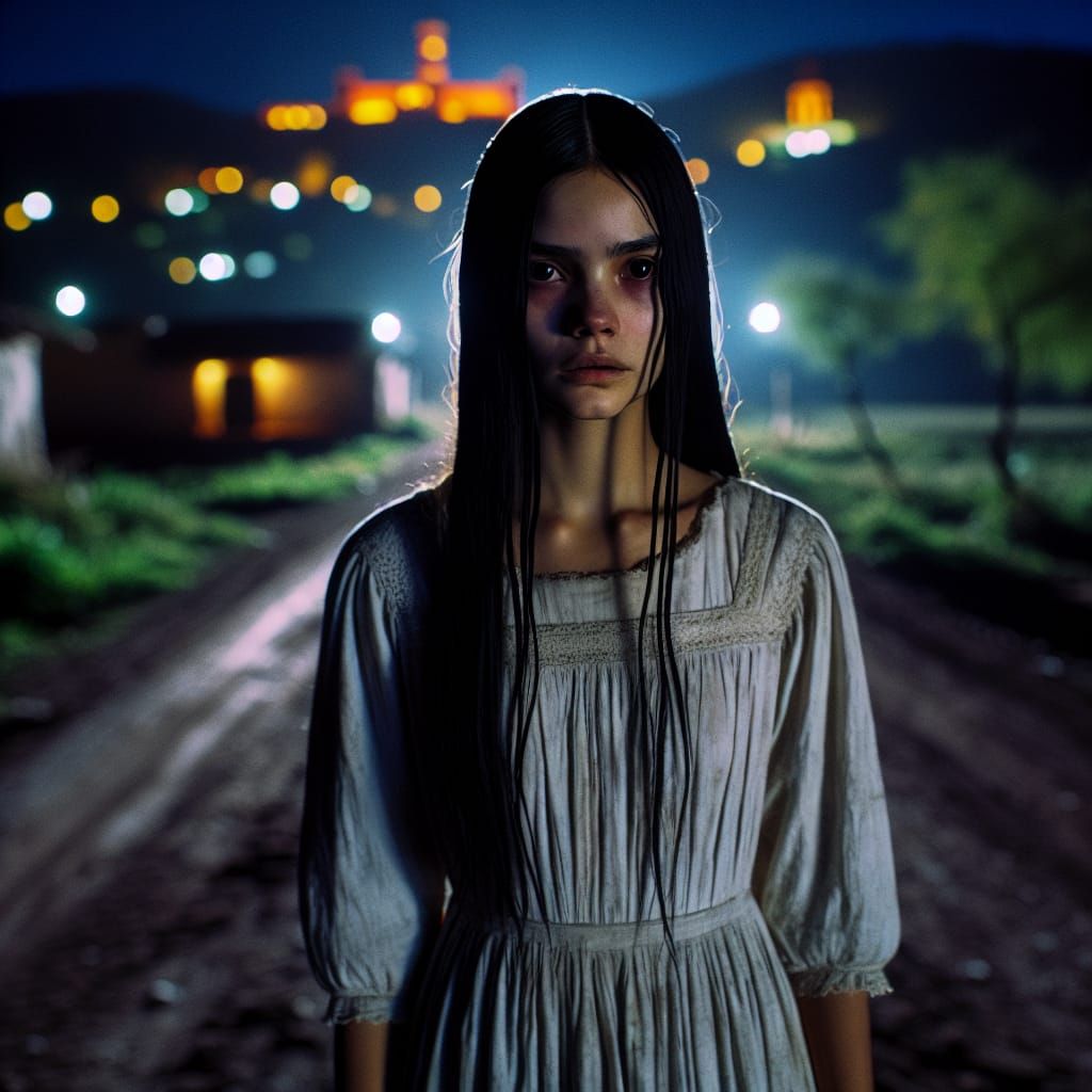 This image captures a young woman in an old white dress walking alone on a dimly lit rural road. The scene evokes vulnerability with dramatic, colorful lighting reminiscent of cinematic horror and folklore, rendered in a hyperrealistic style.