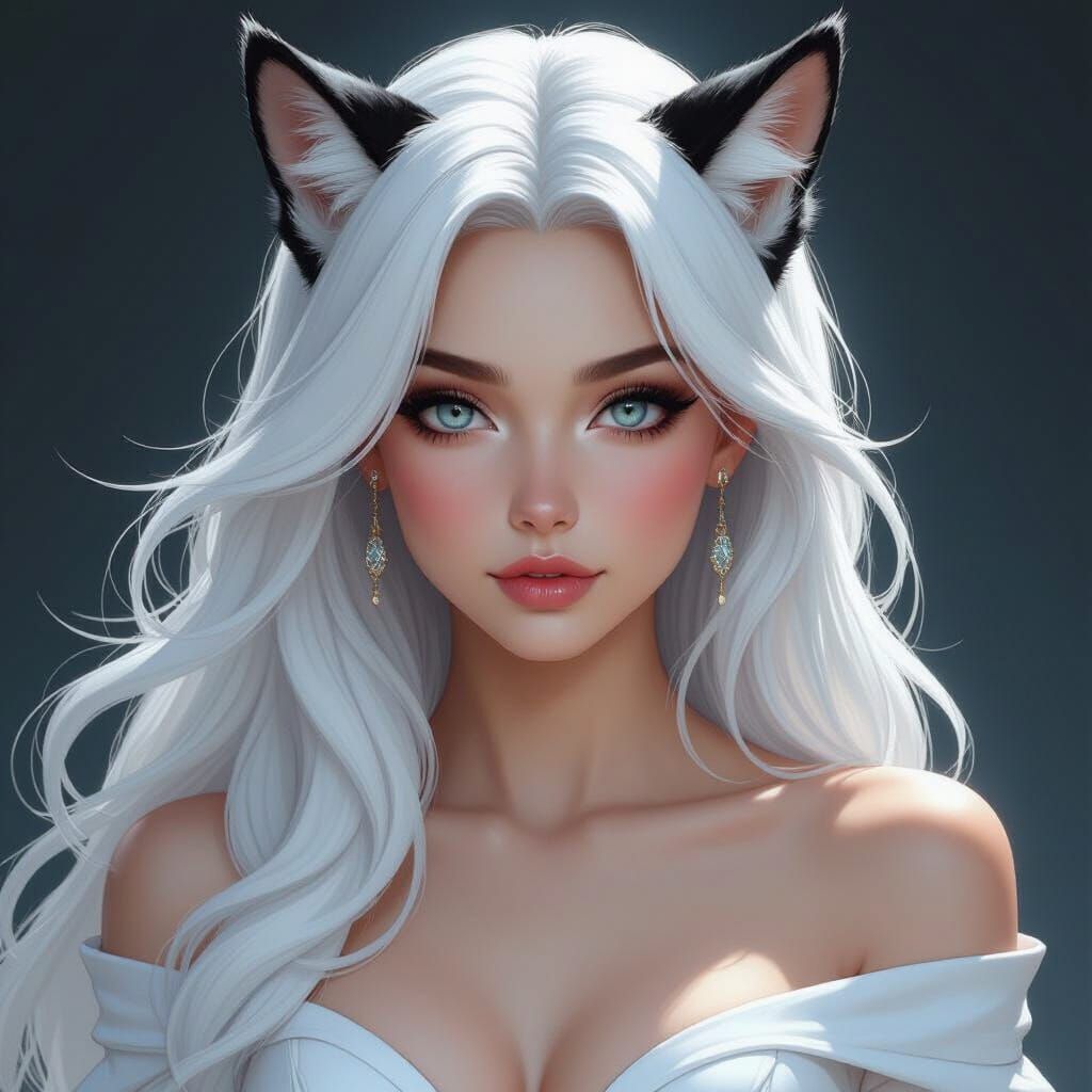 A hyperrealistic image showing a woman with long white hair and heterochromatic eyes, adorned with black fox ears marked by white tiger stripes. She wears an elegant white dress. The image is reminiscent of digital artwork.