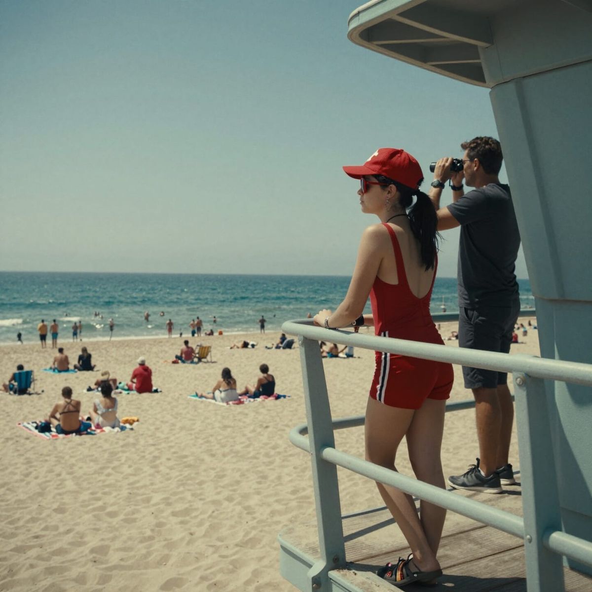 Cinematic film still of a punk girl in a red swimsuit and lifeguard hat at Venice Beach. Features include film grain, cinematic lighting, and an epic, atmospheric quality.