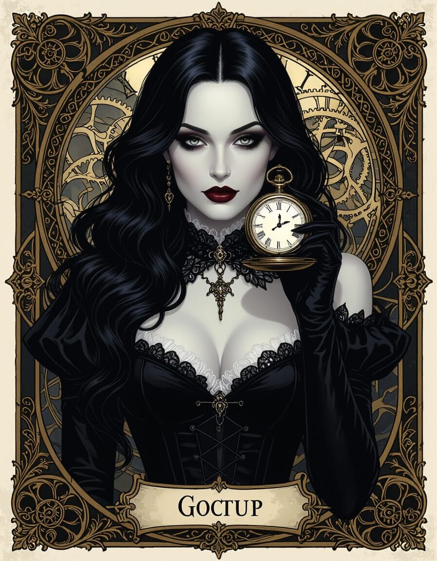 This image depicts a Gothic pin-up character with pale skin and dark hair, holding a pocket watch. The scene features intricate clockwork and arcane symbols, rendered with dramatic lighting.