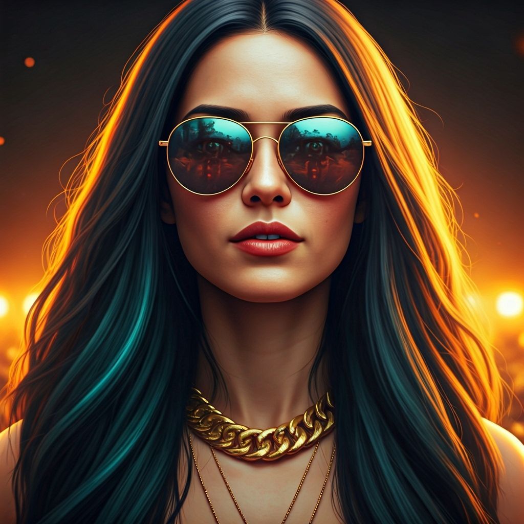This image shows a woman streaking through a crowded concert, wearing sunglasses and a necklace. The artwork features dynamic lighting and intricate details in an art nouveau style.