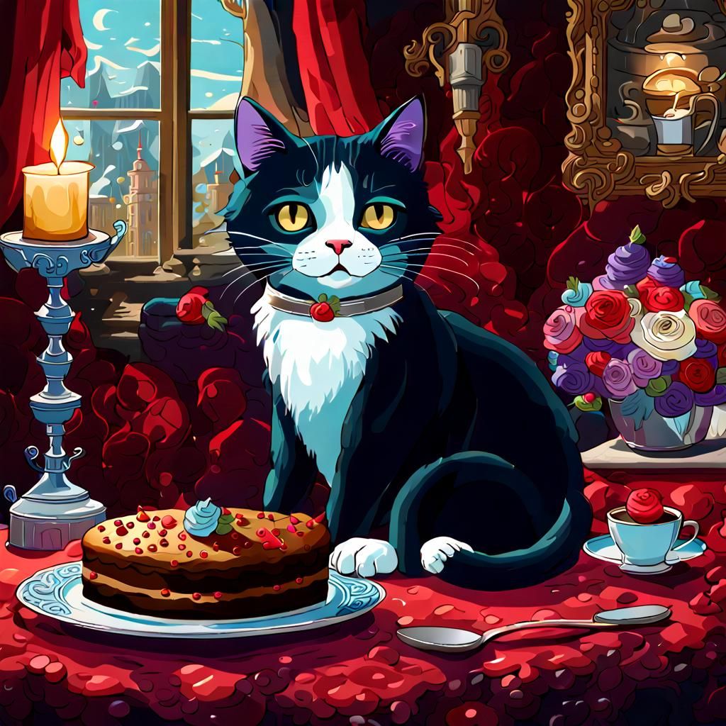 A striking picture of a gothic room featuring cats, cake, and coffee. The image evokes a vintage, mysterious atmosphere with detailed matte painting and complementary colors.