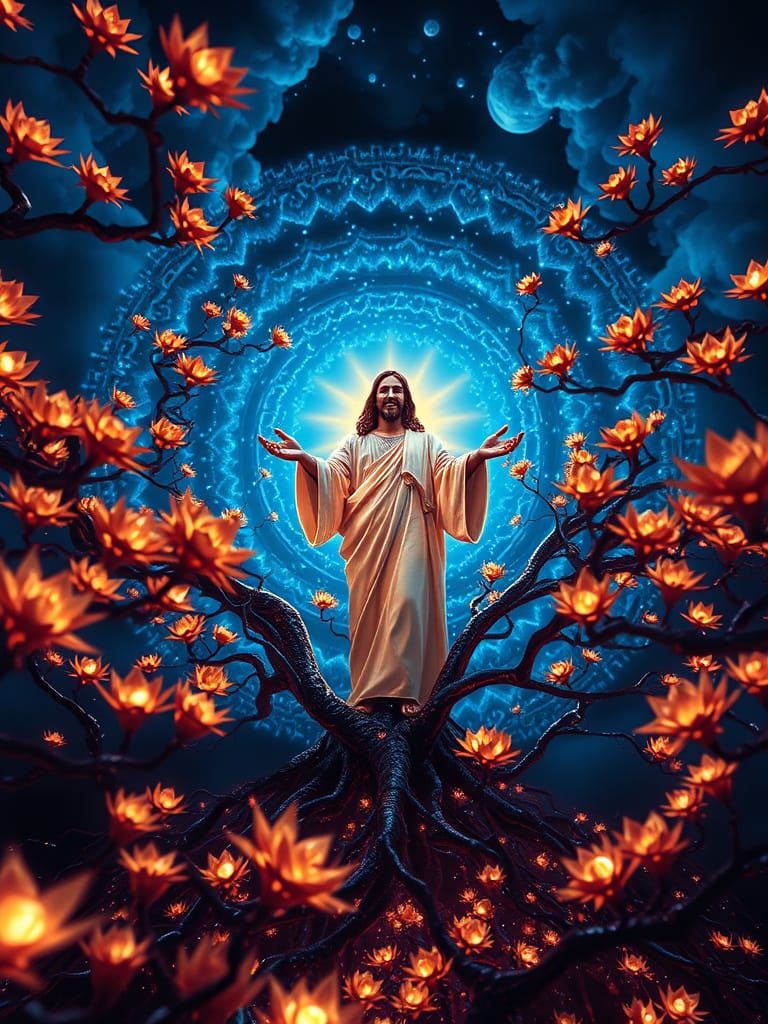 A photorealistic image of an otherworldly tree with radiant white-hot, spindly arms and glowing roots. The background features a reflective obsidian surface with sapphire blue patterns and neon rainbow auras.