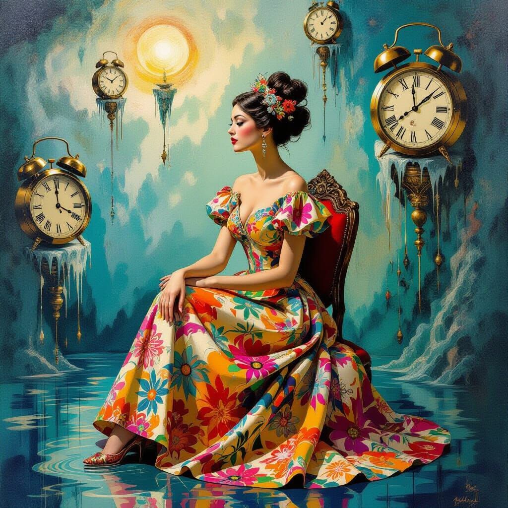 A surreal image of a woman in a dreamscape. The melting clocks and distorted objects create a bizarre atmosphere, while the vibrant colors and intricate details evoke a surrealist painting.