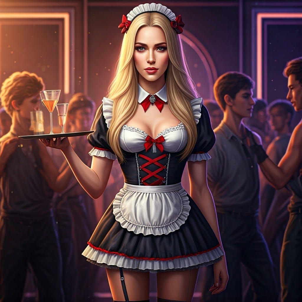 This image captures a confident young man with delicate features and long blonde hair, dressed in a stunning French maid costume, expertly navigating a lively party scene with a tray of drinks. The vibrant atmosphere, flashing lights, and colorful decorations create a captivating backdrop for his beauty...