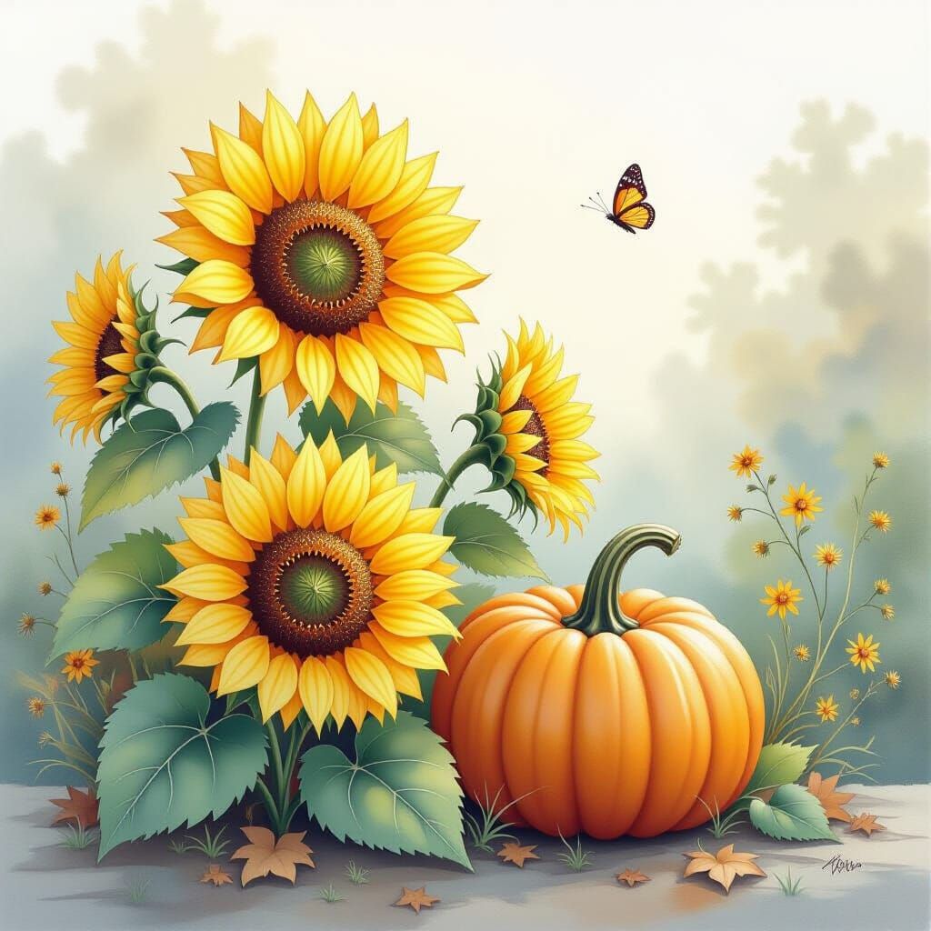This image shows a delicate watercolor painting of sunflowers and a small pumpkin used as a decoration. The artwork features a bright background and ethereal, hyperdetailed elements.