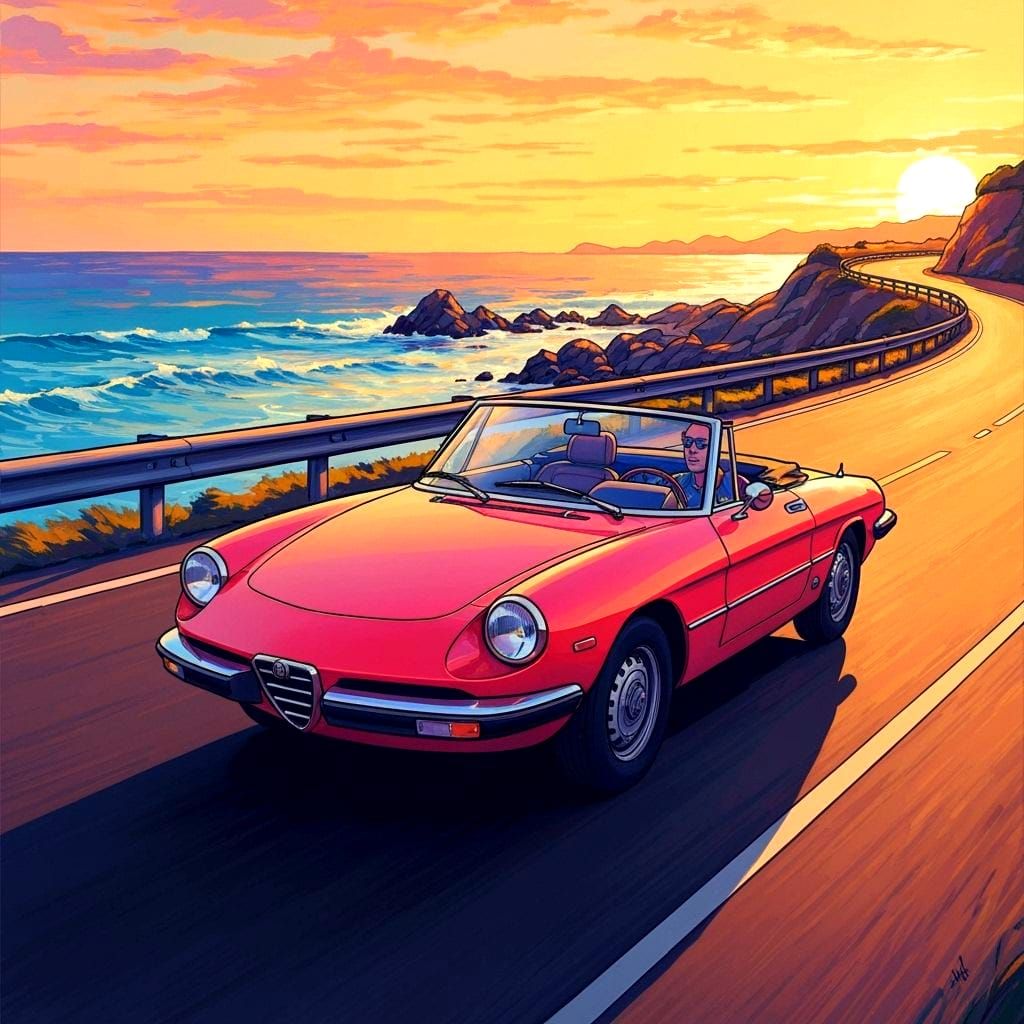 A vibrant, hand-drawn illustration depicts a classic Alfa Romeo Spider driving a scenic coastal route during sunset. Features bold outlines and a cheerful storybook feel with warm, expressive colors.