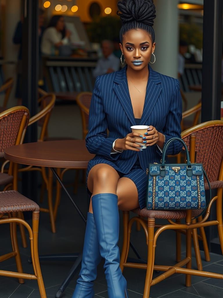This photorealistic image shows a fashionable Black woman elegantly seated at an outdoor cafe, wearing a chic blue pinstriped dress and matching boots. Sophisticated and warm bokeh background.