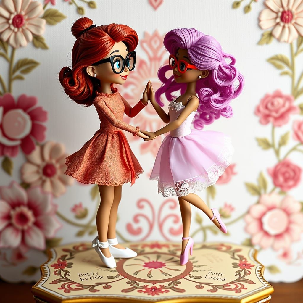 This image shows two clay ballerina dolls on music boxes. One has red hair and the other has pink and purple hair. They are holding hands, looking into each other's eyes, and dancing together.