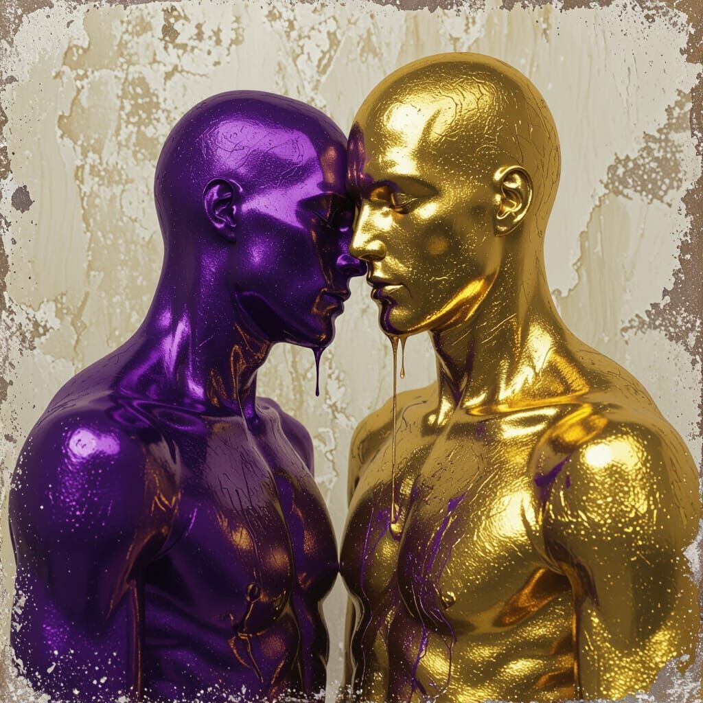 A vintage silver film photograph shows a gold vinyl-skinned man dissolving into his purple reflection. Features detailed matte painting and complementary colors, reminiscent of fantasy concept art.