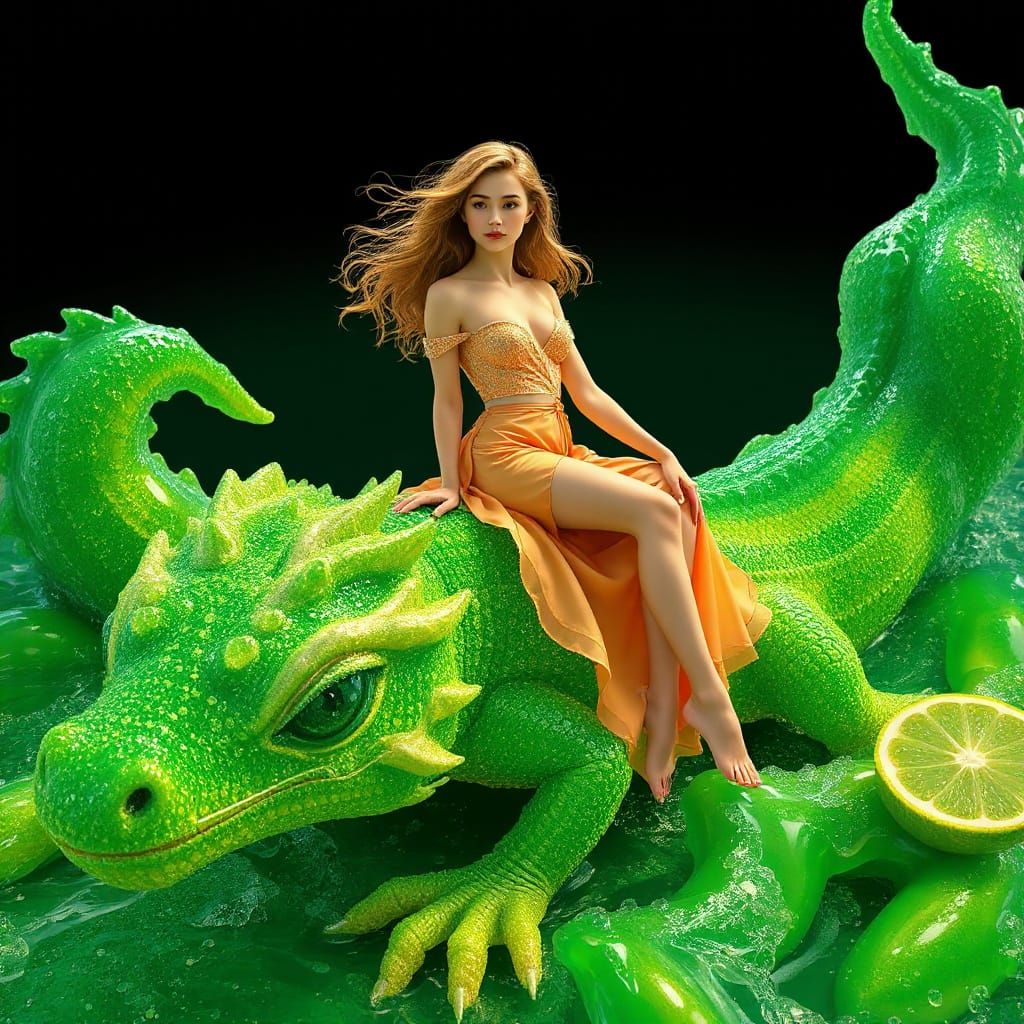 A serene woman with golden hair sits on a giant gummy salamander. She's in a surreal soda ocean with neon glows, depicted with delicate linework and digital painting.