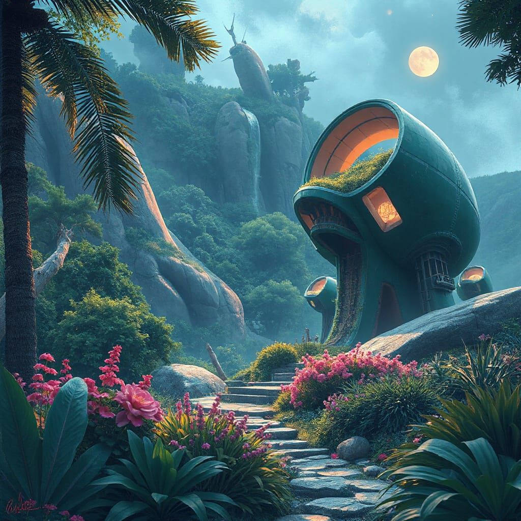 This image shows a whimsical landscape blending futuristic and fantastical elements. Lush greenery meets neon accents and pastel colors, rendered with expressive brushstrokes and textured details in a painterly style.