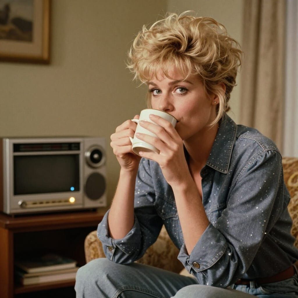 This photo-realistic image captures a blonde woman in a 1980s living room, sipping from a mug with a hint of doubt. A vintage VCR adds to the nostalgic, comedic scene, rendered with warm lighting and saturated colors.