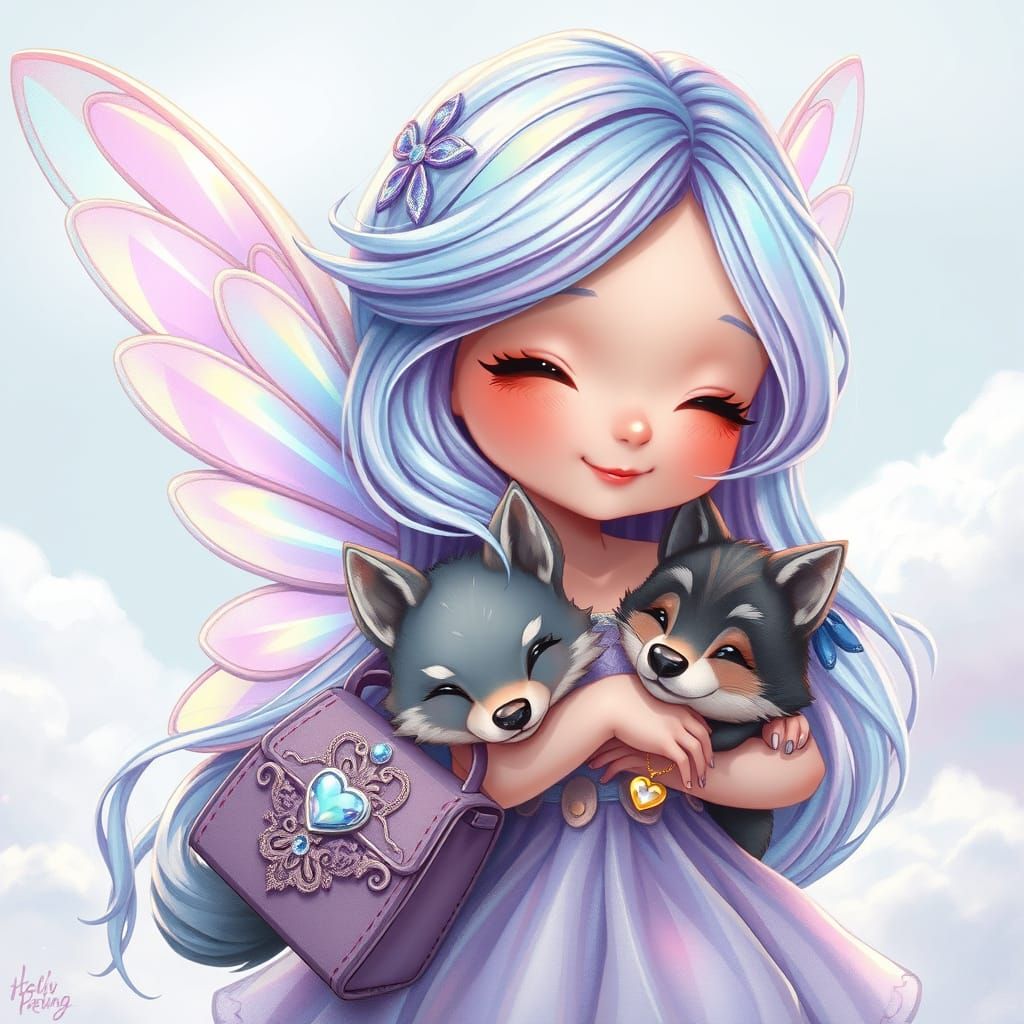 This enchanting image depicts a delicate, hyperrealistic fairy girl with soft chibi features, holding a lace-trimmed bag and surrounded by a whimsical atmosphere. Her pastel-hued hair and shimmering wings reflect holographic light, creating a kaleidoscope of colors. A chibi wolf by her side conveys deep ...