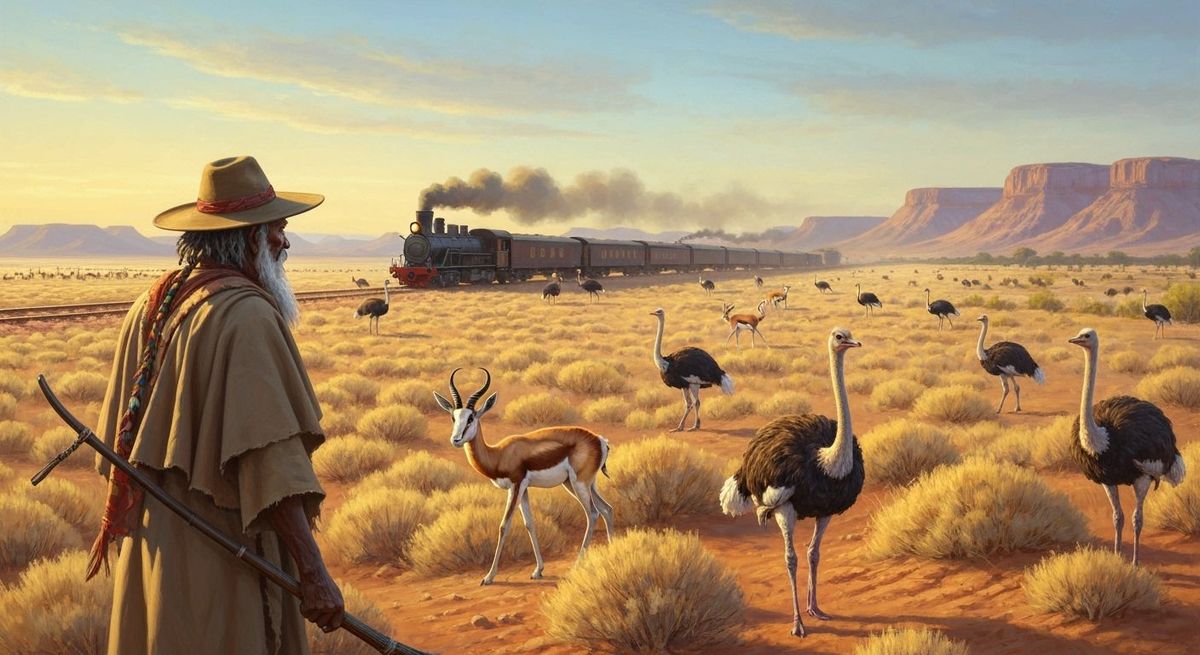 This image depicts a traditional Bushman observing a vintage train in the dry Karoo region of South Africa, with wildlife present. The scene is artfully rendered with rich earthy tones and dramatic lighting, evoking historical exploration art.