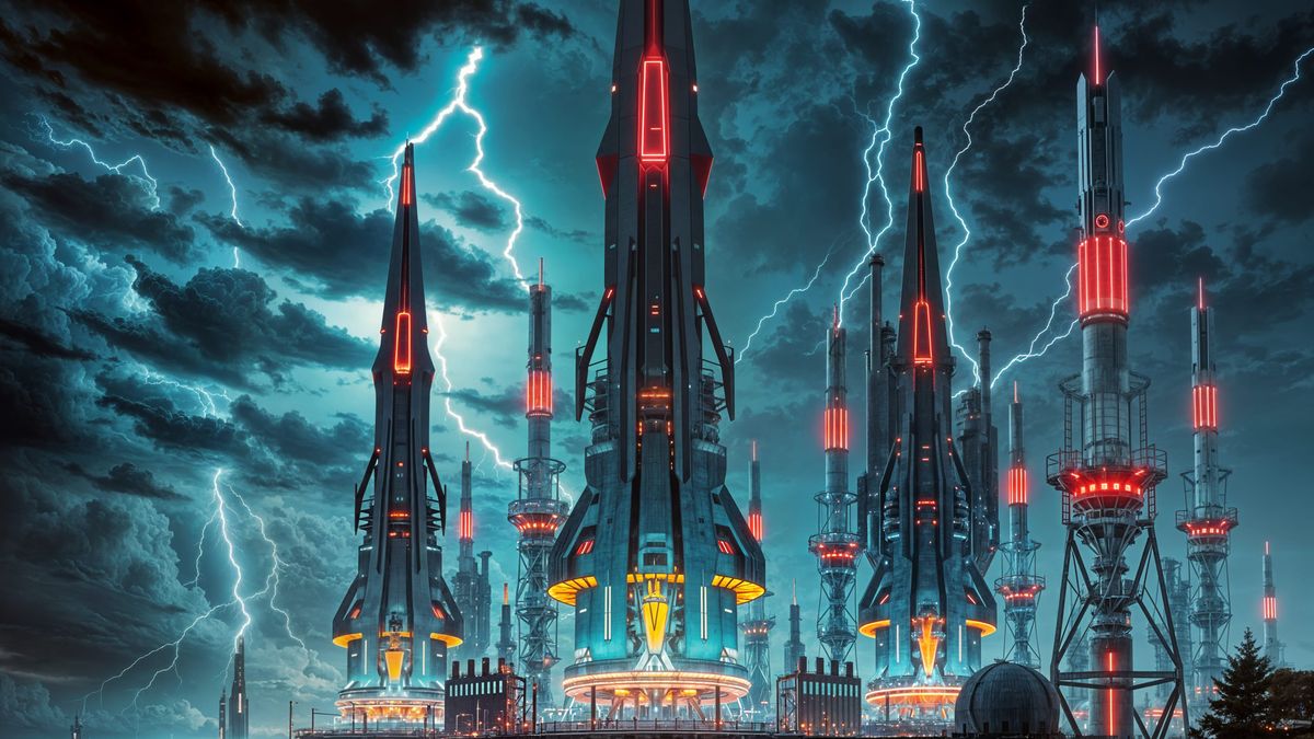 This image shows a massive futuristic power plant harnessing and distributing lightning energy to the electrical grid, with a focus on cutting-edge technology and sustainable energy solutions