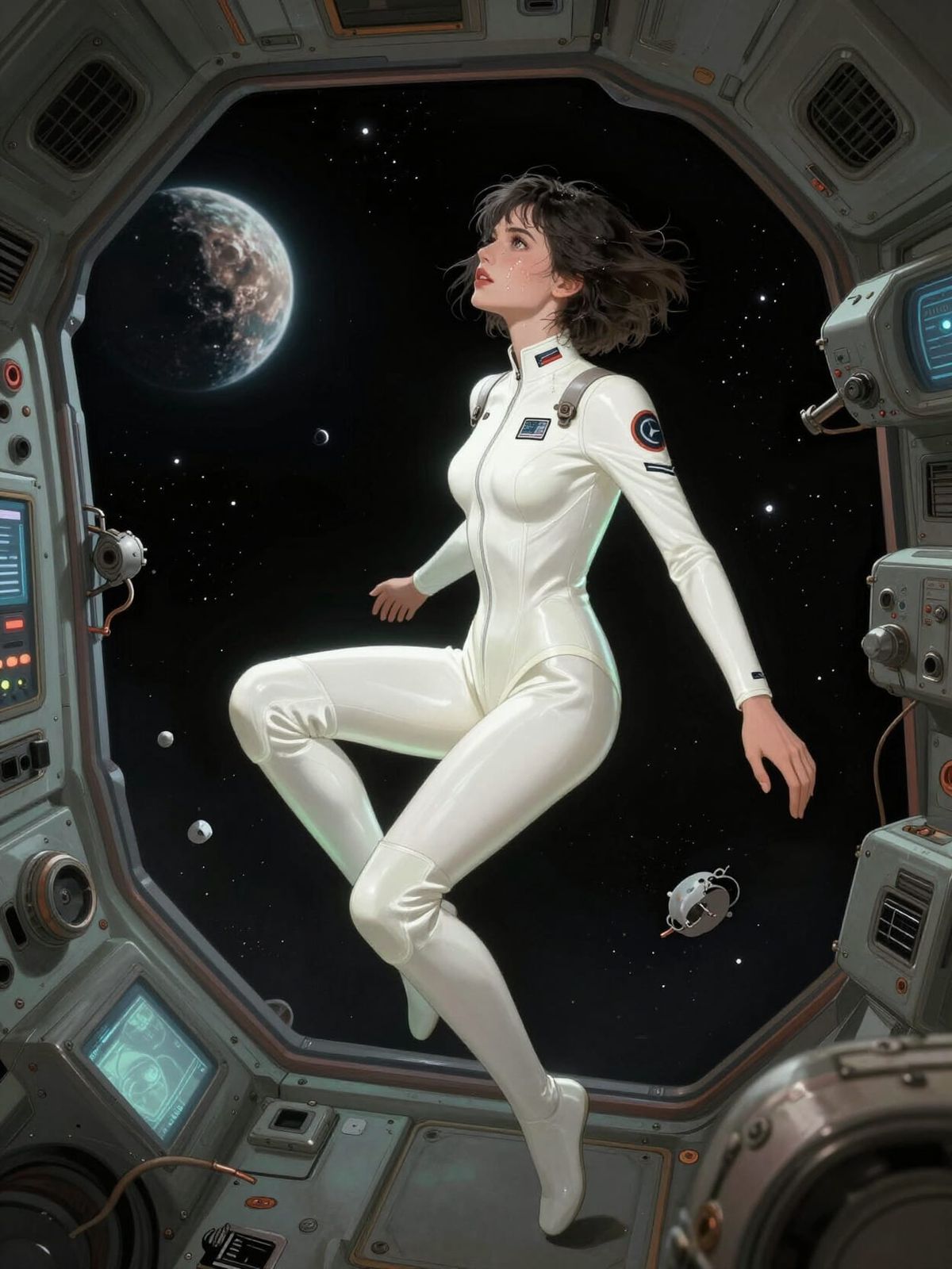 This image showcases a woman in a retro futuristic space vessel, depicted in a detailed illustration style with soft lighting and a romantic atmosphere.