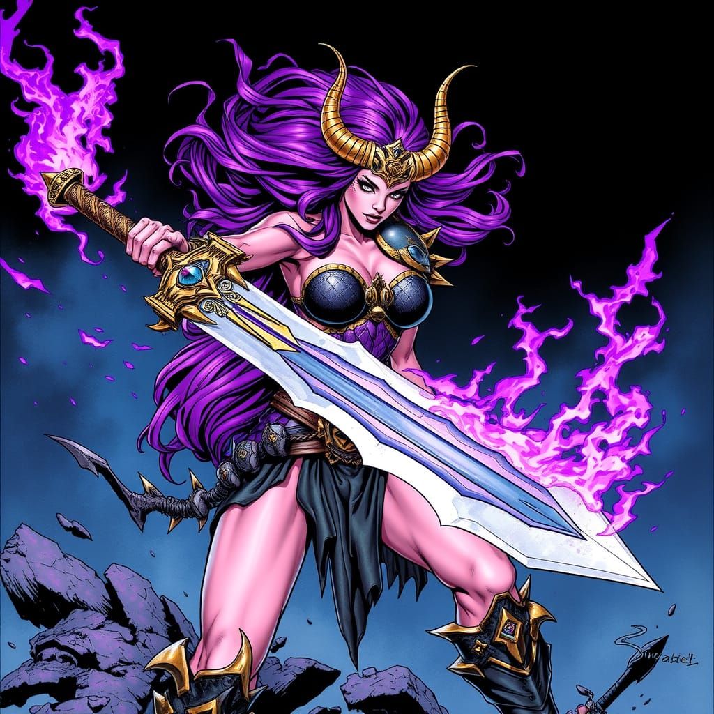 A vibrant image of a female tiefling barbarian warrior. She wields a flaming greatsword, rendered with dynamic lines and comic book aesthetics. The artwork evokes a fantasy concept art style.