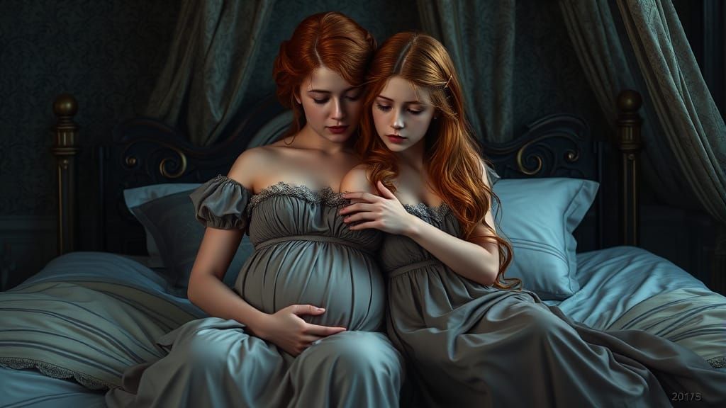 A poignant scene of a duchess embracing her teenage daughter, both clad in nightgowns, amidst a richly detailed and fantastical 8K environment, evoking a sense of deep emotional connection and nostalgia for a bygone era.